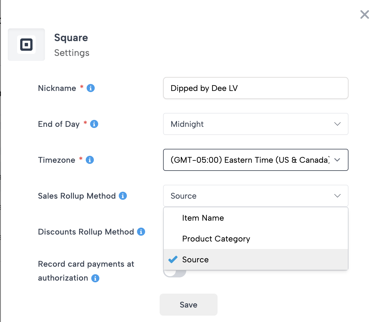 The default posting method for Square is Product Category. To change it to Item Name or Order Source: