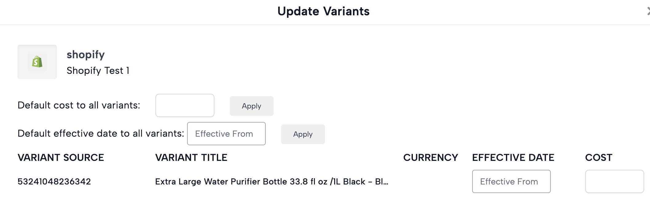 Update the Cost and Effective Date columns for each variant. These columns will be pre-filled with the most recent values, if available.