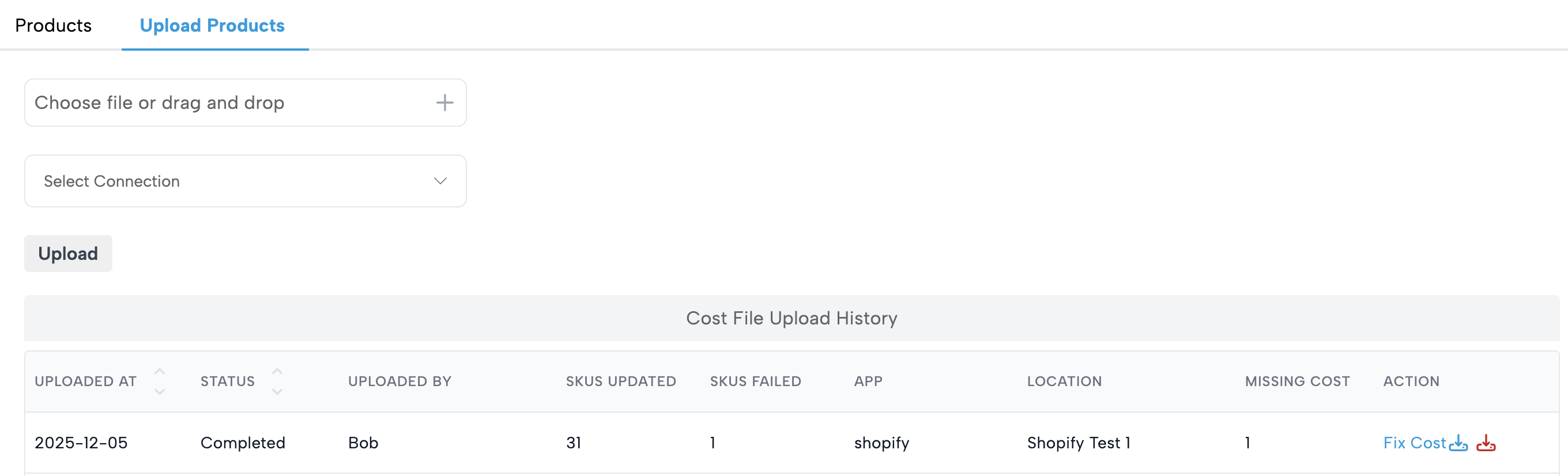 You can also click the blue icon to download the exact file you uploaded. The Fix Cost button is useful as it opens a modal listing all variants still missing a cost.