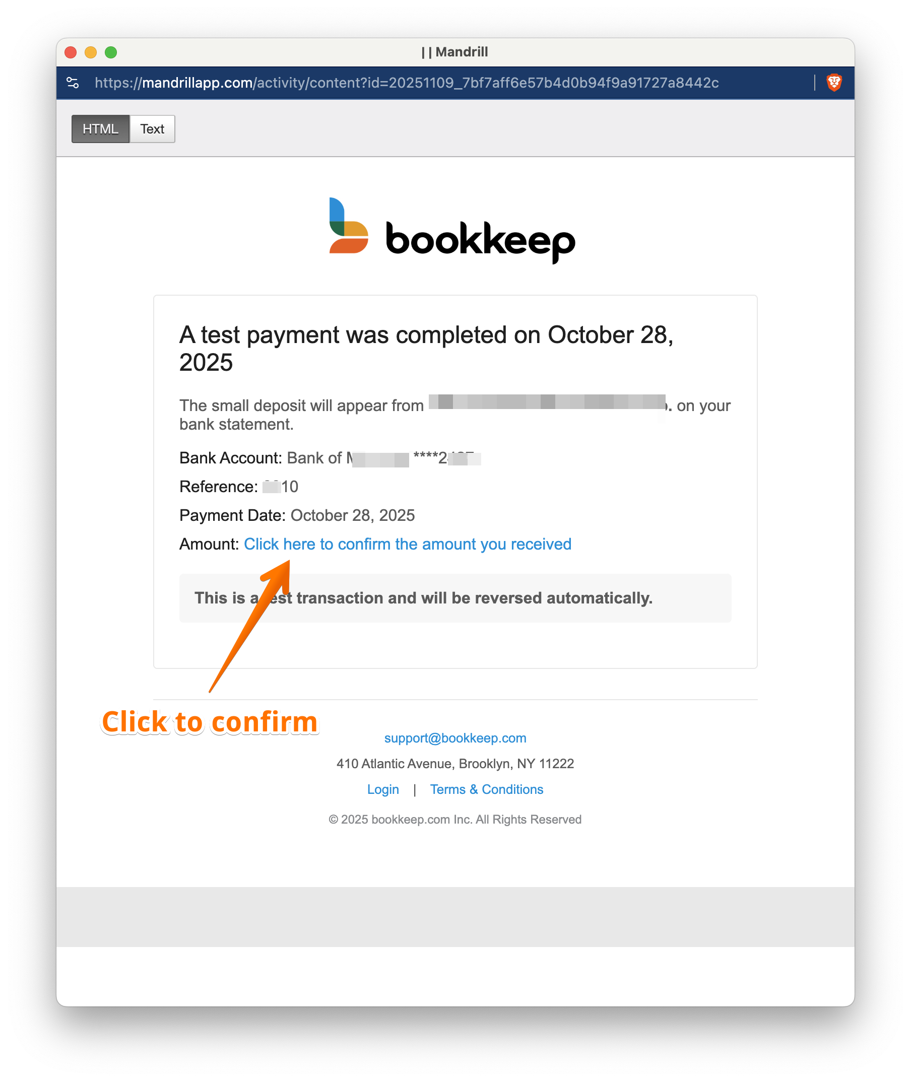 Click the "Verify Test Payment" button or link in the email. This will take you to the verification page on the BK Nozap platform.