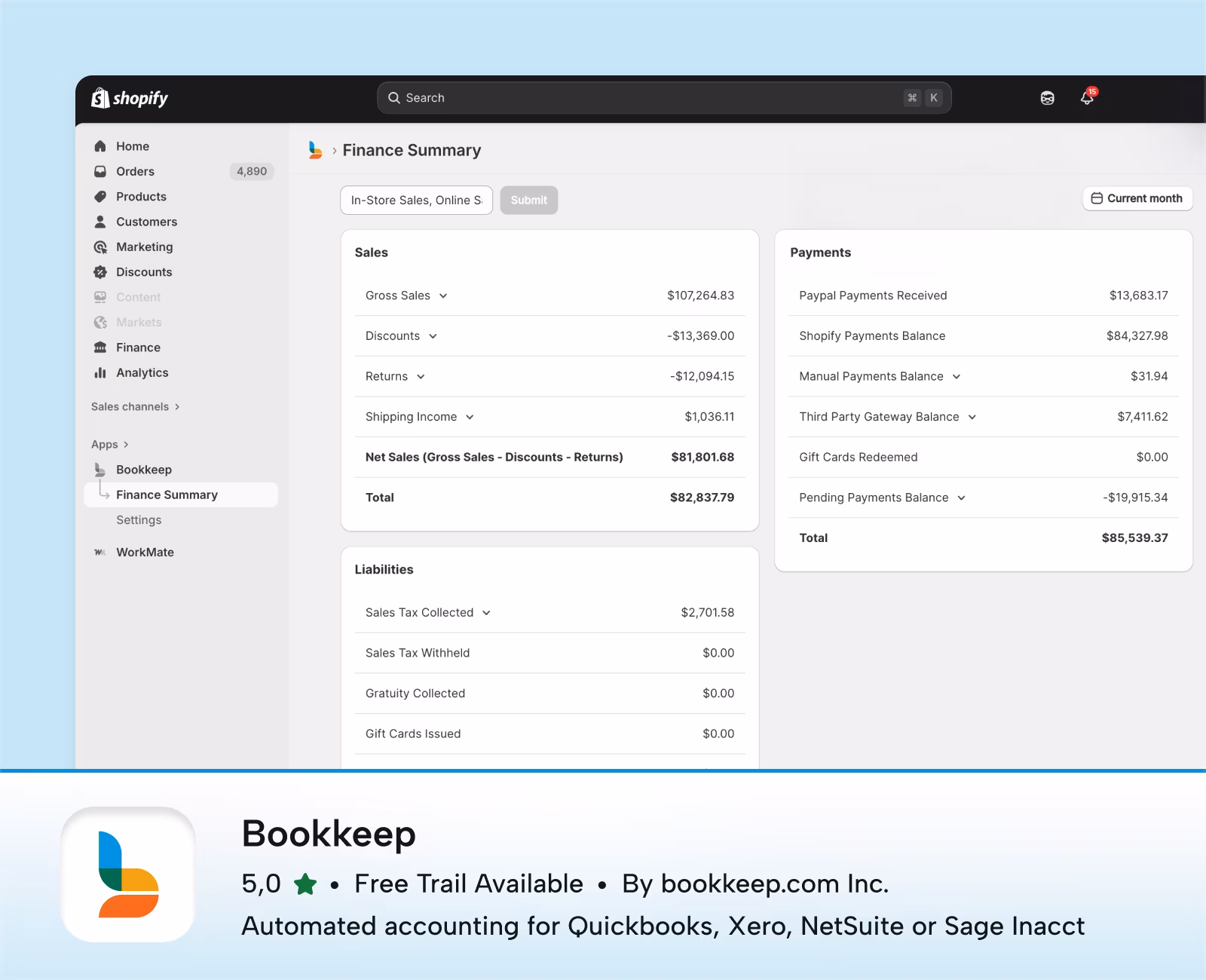 This app keeps QBO up to date on a daily basis. My financial statement are always current I always know exactly how our business is doing. On occasion where something has changed in Shopify or one of payment forms, customer support at Bookkeep quickly resolves the issues.
