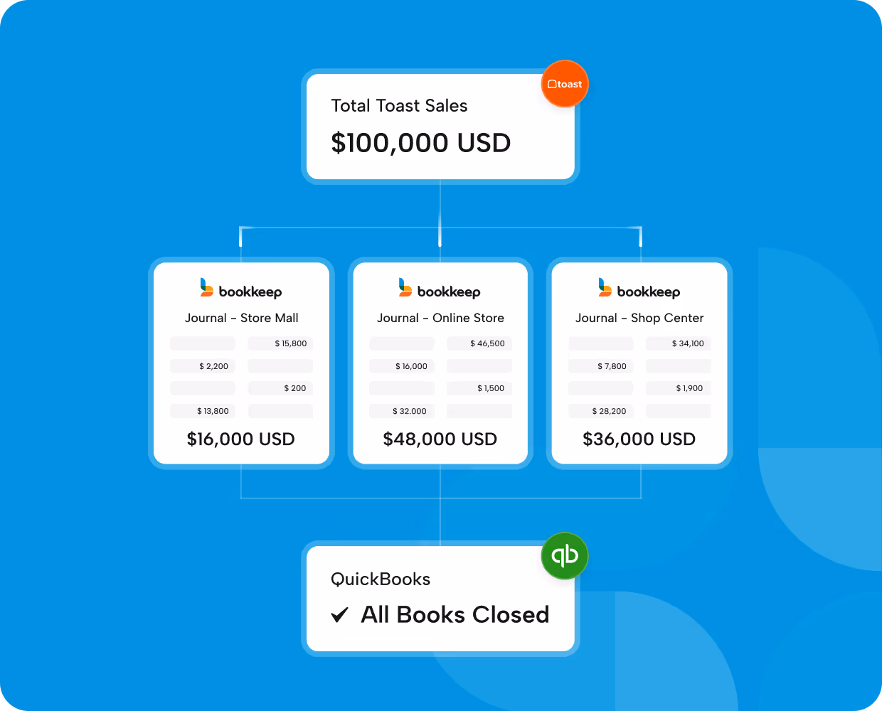 Bookkeep connects Toast, Square and other restaurant POS systems to your accounting platform — automating daily sales, revenue recognition, and reconciliations. Scale your restaurant group without manual spreadsheets or late-night cleanup.